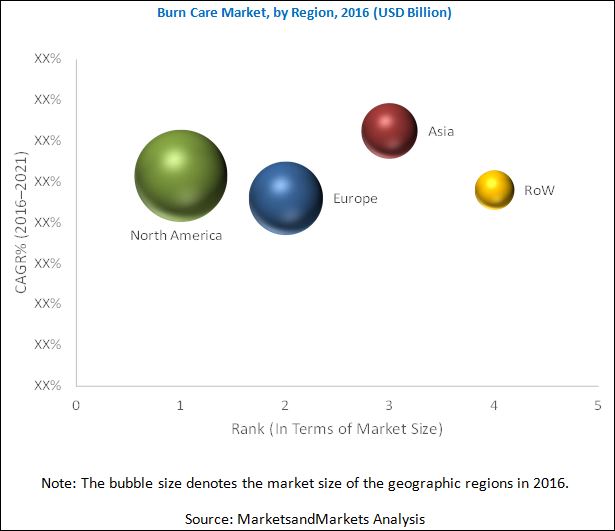 Based on regions, the burn care market is segmented into North America, Europe, Asia, and the Rest of the World (RoW). North America is expected to account for the largest share of the market in 2016. Factors such as increasing demand for biologics like skin grafts and its substitutes and high usage of advanced dressings in the U.S. are driving growth in the North American burn care market.