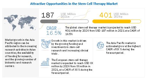 According to the new market research report “Stem Cell Therapy Market by Type (Allogeneic, Autologous), Therapeutic Application (Musculoskeletal, Wound & Injury, CVD, Autoimmune & Inflammatory), Cell Source (Adipose tissue, Bone Marrow, Placenta/Umbilical Cord) – Global Forecasts to 2026″, published by MarketsandMarkets™, the global market is projected to reach USD 401 million by 2026 from USD 187 million in 2021, at a CAGR of 16.5% during the forecast period.