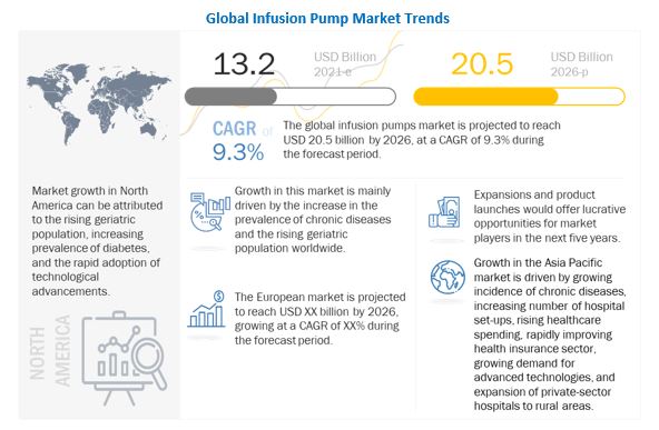 According to the new market research report “Infusion Pump Market by Product [Accessories (Dedicated, Non-dedicated), Devices (Volumetric, Insulin, Syringe, Ambulatory)], Technology (Traditional, Specialty), Application (Cancer, Diabetes), & Setting (Hospital, Homecare) – Global Forecast to 2026″, published by MarketsandMarkets™, the global market is expected to reach USD 20.5 Billion by 2026 from an estimated USD 13.2 Billion in 2021, at a CAGR of 9.3%.