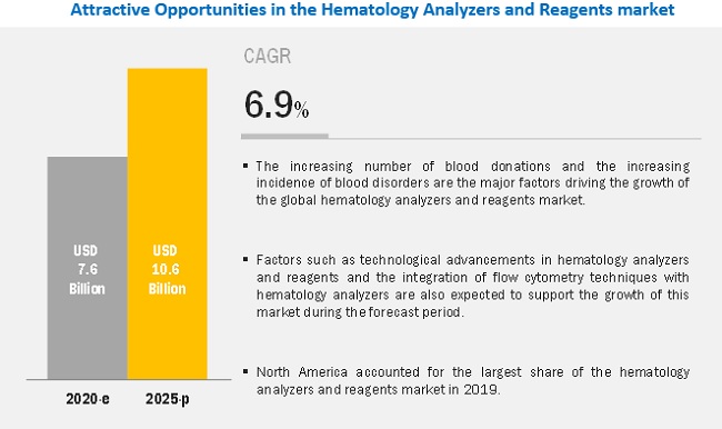 According to the new market research report “Hematology Analyzers and Reagents Market by Products & Services [Hematology Analyzers (5 Parts, 6 Parts, 3 Part, PoC, Semi-Automated), Hemostasis, Immunohematology], Price Range (High, Low), End User (Government labs) – Global Forecast to 2025”, published by MarketsandMarkets™, the Hematology Analyzers and Reagents Market is projected to reach USD 10.6 billion by 2025 from USD 7.6 billion in 2020, at a CAGR of 6.9% during the forecast period.