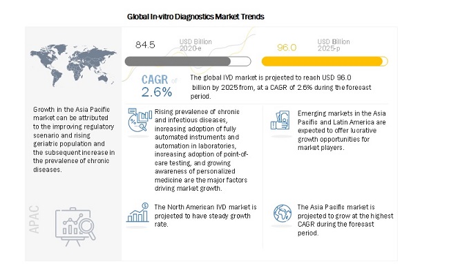 According to the new market research report “In-Vitro Diagnostics Market by Product & Service (Instrument, Kits), Technology (Immunoassay, MDx, Hematology, Urinalysis), Application (Diabetes, Oncology, Cardiology, Nephrology, Infectious Diseases) End User (Hospitals) – Global Forecast to 2025″, published by MarketsandMarkets™, the global IVD Market size is projected to reach USD 96.0 billion by 2025 from USD 84.5 billion in 2020, at a CAGR of 2.6% during the forecast period.