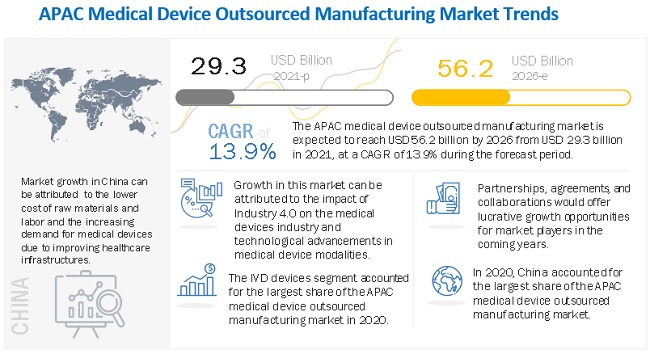 According to the new market research report ” Medical Device Outsourced Manufacturing Market by Device Type (IVD (Equipment, Consumable), Diabetes, Respiratory, Cardiovascular, Personal Care, Endoscopy, Dental, Ophthalmology, Devices) Class of Device, Services, Procedure – APAC Forecast to 2026″, published by MarketsandMarkets™, the APAC Medical Device Outsourced Manufacturing Market is projected to reach USD 56.2 billion by 2026 from USD 29.3 billion in 2021 and is expected to grow at a CAGR of 13.9% during the forecast period.