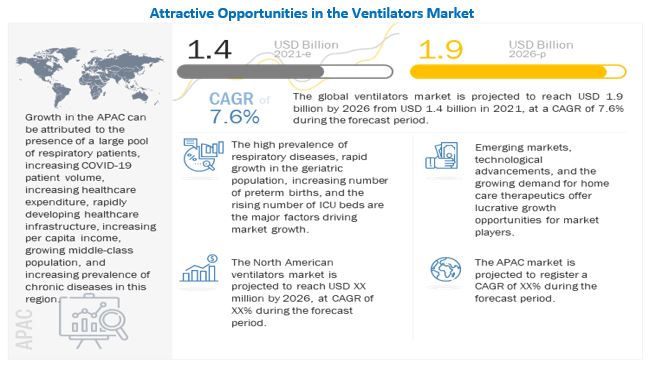According to the new market research report “Ventilators Market by Mobility (Intensive Care, Portable), Type, Mode (Volume, Pressure, Combined), Interface (Invasive, Non-invasive), End-User (Hospital, Clinic, Home Care, ACC, Emergency Medical Services), Region – Global Forecast to 2026″, published by MarketsandMarkets™, the global market is projected to reach USD 1.9 billion in 2026 from USD 1.4 billion in 2021, at a CAGR of 7.6% during the forecast period.