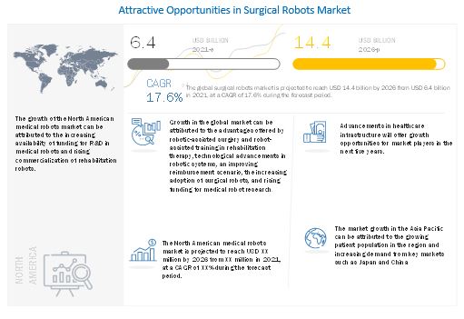 According to the new market research report Surgical Robots Market by Product & Service (Instruments & Accessories, Systems, Service), Application (Urological Surgery, Gynecological Surgery, Orthopedic Surgery), End User (Hospitals, Ambulatory Surgery Center) – Analysis and Global Forecasts to 2026″, published by MarketsandMarkets™, the global market is projected to reach USD 14.4 billion by 2026 from an estimated USD 6.4 billion in 2021, at a CAGR of 17.6%.