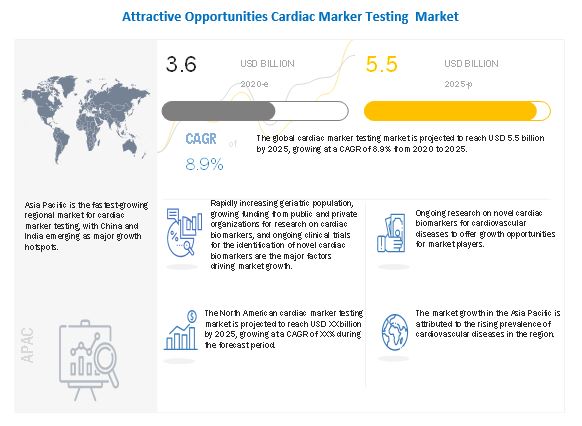 The global Cardiac marker testing market size is projected to reach USD 5.5 billion by 2025 from USD 3.6 billion in 2020, at a CAGR of 8.9% during the forecast period such as the growing incidence of cardiovascular diseases, rapidly increasing geriatric population, growing funding from public and private organizations for research on cardiac biomarkers, and ongoing clinical trials for the identification of novel cardiac biomarkers. However, factors such as technical problems related to sample collection and storage and issues related to regulatory and reimbursement systems are expected to restrain market growth to a certain extent.
