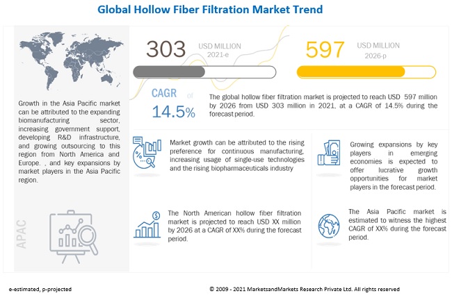 The global Hollow fiber filtration market is projected to reach USD 597 million by 2026 from USD 303 million in 2021, at a CAGR of 14.5% during the forecast period.
