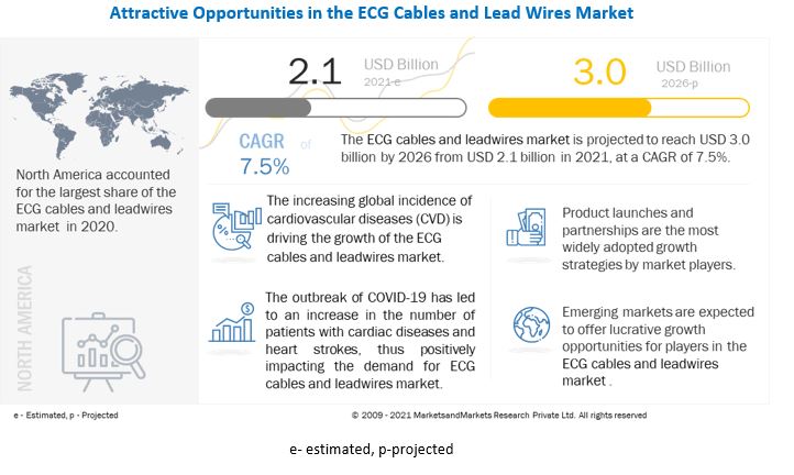The global ECG cables and lead wires market is projected to reach USD 3.0 billion by 2026 from USD 2.1 billion in 2021, at a CAGR of 7.5% during the forecast period.