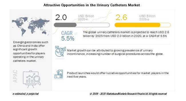 The global urinary catheters market size is projected to reach USD 2.6 billion by 2025 from USD 2.0 billion in 2020, at a CAGR of 5.5% during the forecast period.