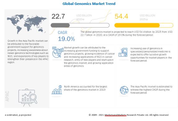 The global Genomics Market is projected to reach USD 54.4 billion by 2025 from USD 22.7 billion in 2020, at a CAGR of 19.0% during the forecast period.