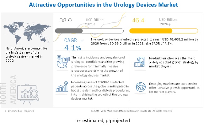 The global urology devices market is projected to reach USD 46.4 billion by 2026 from USD 38.0 billion in 2021, at a CAGR of 4.1%.