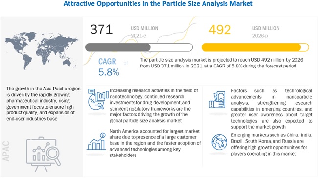 The global Particle size analysis market size is projected to reach USD 492 million by 2026 from USD 371 million in 2021, growing at a CAGR of 5.8%.