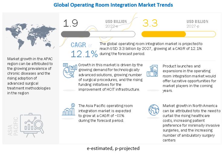 “Operating Room Integration Market by Component (Hardware, Software, Service), Application (General, Orthopedic, & Cardiovascular Surgery), Device (Audio & Video Management, Display, Document Management), End User (Hospital, ASC) – Global Forecast to 2027″, published by MarketsandMarkets™, the global Operating Room Integration Market is projected to reach USD USD 3.3 billion by 2027 from an estimated USD 1.9 billion in 2022, at a CAGR of 12.1% during the forecast period.