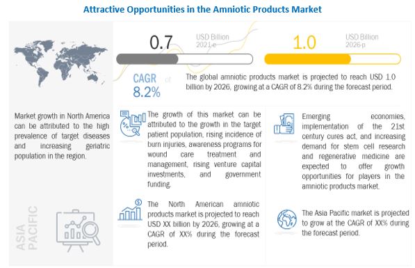 “Amniotic Products Market by Type (Amniotic Membranes (Cryopreserved Amniotic Membranes, Dehydrated Amniotic Membranes), Amniotic Suspensions), Application (Wound Care, Ophthalmology, Orthopedics), End User (Hospitals, ASCs) – Global Forecast to 2026″, published by MarketsandMarkets™, the global Amniotic Products Market is projected to USD 1.0 billion by 2026 from USD 0.7 billion in 2021, at a CAGR of 8.2% during the forecast period.