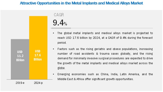 The global Medical Alloys Market is projected to reach USD 17.6 billion by 2024 from USD 11.2 billion in 2019, at a CAGR of 9.4%.