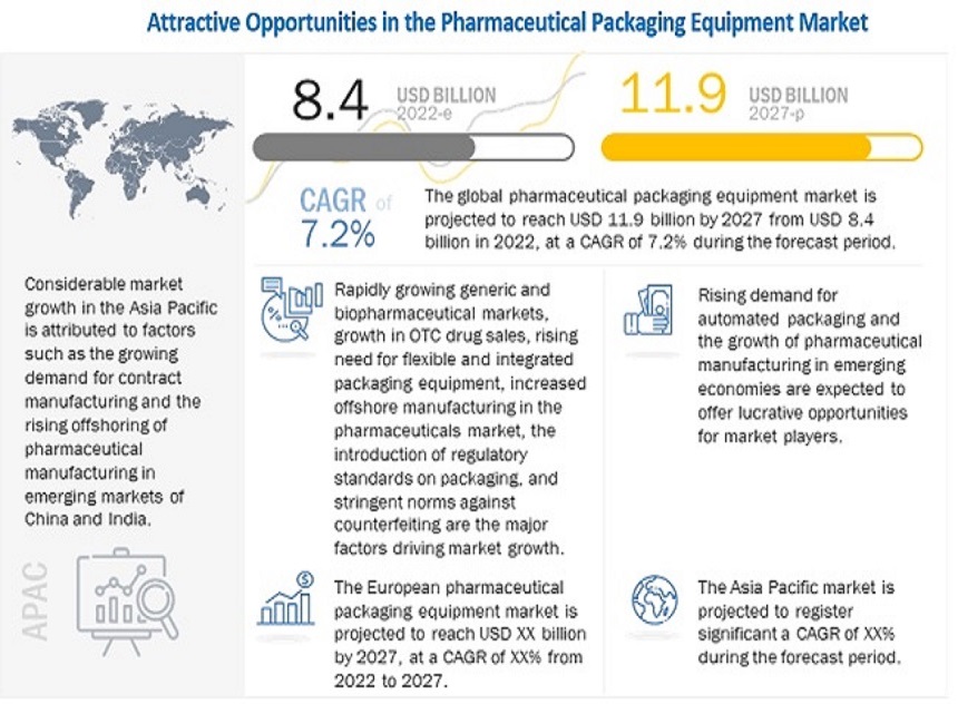 The global pharmaceutical packaging equipment market is projected to reach USD 11.9 Billion by 2027 from USD 8.4 Billion in 2022, at a CAGR of 7.2% from 2022 to 2027.