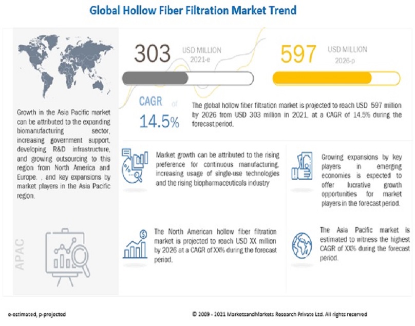 The global Hollow fiber filtration market is projected to reach USD 597 million by 2026 from USD 303 million in 2021, at a CAGR of 14.5% during the forecast period.