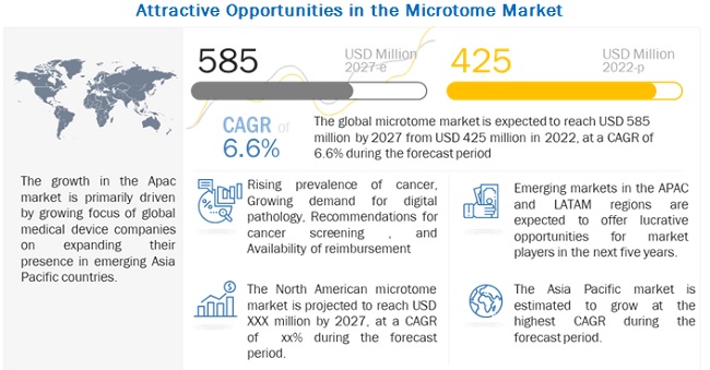 The global Microtome Market is expected to reach USD 585 million by 2027 from USD 425 million in 2022, at a CAGR of 6.6% during the forecast period.