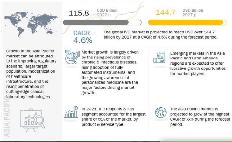 The global in vitro diagnostics market in terms of revenue was estimated to be worth $115.8 billion in 2022 and is poised to reach $144.7 billion by 2027, growing at a CAGR of 4.6% from 2022 to 2027. Growth in the market is driven by growing demand for point-of-care devices and rapid diagnostic testing, increasing prevalence of chronic diseases, and increasing willingness to pay for preventive care testing. However, an unfavorable reimbursement scenario is expected to restrain the growth of this market during the forecast period.