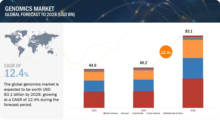 The report Genomics Market is projected to reach USD 83.1 billion by 2028 from USD 46.2 billion in 2023, at a CAGR of 12.4% during the forecast period of 2023 to 2028.