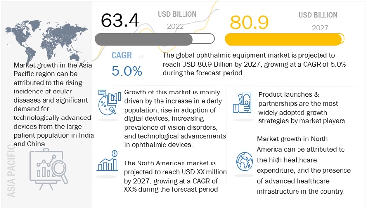 The report Ophthalmic Equipment Market is projected to reach USD 80.9 billion by 2027 from USD 63.4 billion in 2022, at a CAGR of 5.0%.