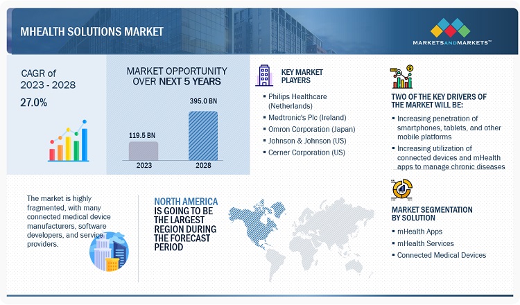The report mHealth Solutions Market is projected to reach USD 395.0 billion by 2028 from USD 119.5 billion in 2023, at a CAGR of 27.0% during the forecast period.