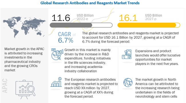 Currently, Research Antibodies & Reagents Market is growing at a Compound Annual Growth Rate (CAGR) of 6.7 % to reach USD 16.1 billion by 2027. The research antibodies and reagents market are segmented into reagents and antibodies. The antibodies segment is expected to grow at highest CAGR in forecast periods (2022-2027). Factors such as antibodies use for research offer high specificity and selectivity and are used ubiquitously in biochemical and medical research for protein-target identification, regulatory characterization, and discovery, are driving the market.