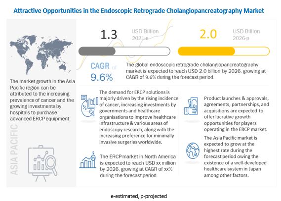 The global ERCP market in terms of revenue was estimated to be worth $1.3 billion in 2021 and is poised to reach $2.0 billion by 2026, growing at a CAGR of 9.6% from 2021 to 2026.