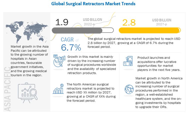 The global report Surgical Retractors Market is projected to reach USD 2.8 billion by 2027 from USD 1.9 billion in 2022, at a CAGR of 6.7%.