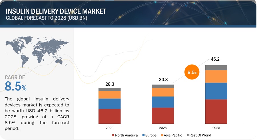 The Insulin Delivery Devices Market is poised for remarkable growth, with a projected CAGR of 8.5%. By 2028, it is anticipated to reach a value of $46.2 billion, up from $30.8 billion in 2023.