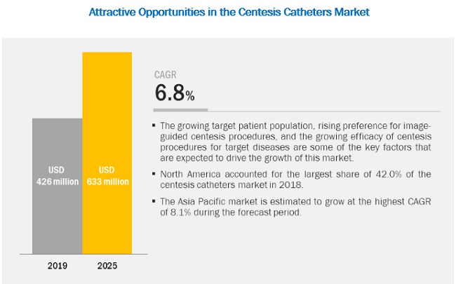 The report Centesis Catheters Market is projected to reach USD 633 million by 2025 from USD 426 million in 2019, at a CAGR of 6.8%.