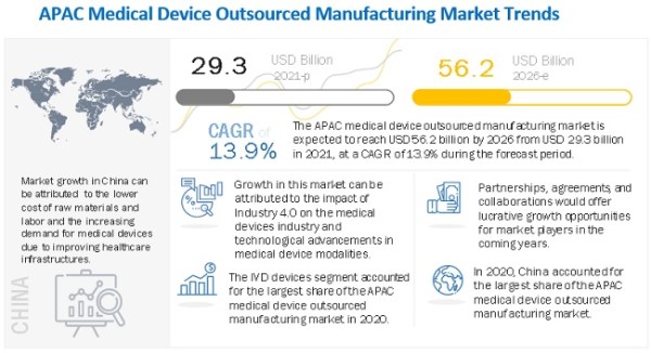 According to the new market research report " Medical Device Outsourced Manufacturing Market by Device Type (IVD (Equipment, Consumable), Diabetes, Respiratory, Cardiovascular, Personal Care, Endoscopy, Dental, Ophthalmology, Devices) Class of Device, Services, Procedure - APAC Forecast to 2026", published by MarketsandMarkets™, the APAC Medical Device Outsourced Manufacturing Market is projected to reach USD 56.2 billion by 2026 from USD 29.3... Continue Reading →